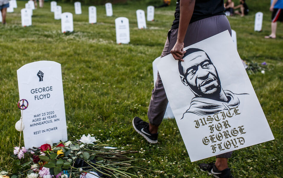 Une personne tient un portrait de George Floyd lors d'une veillée sur les lieux d'une installation dédiée à sa mémoire et intitulée “Say their names”, à Minneapolis, le 7 juin. © Kerem Yucel/AFP