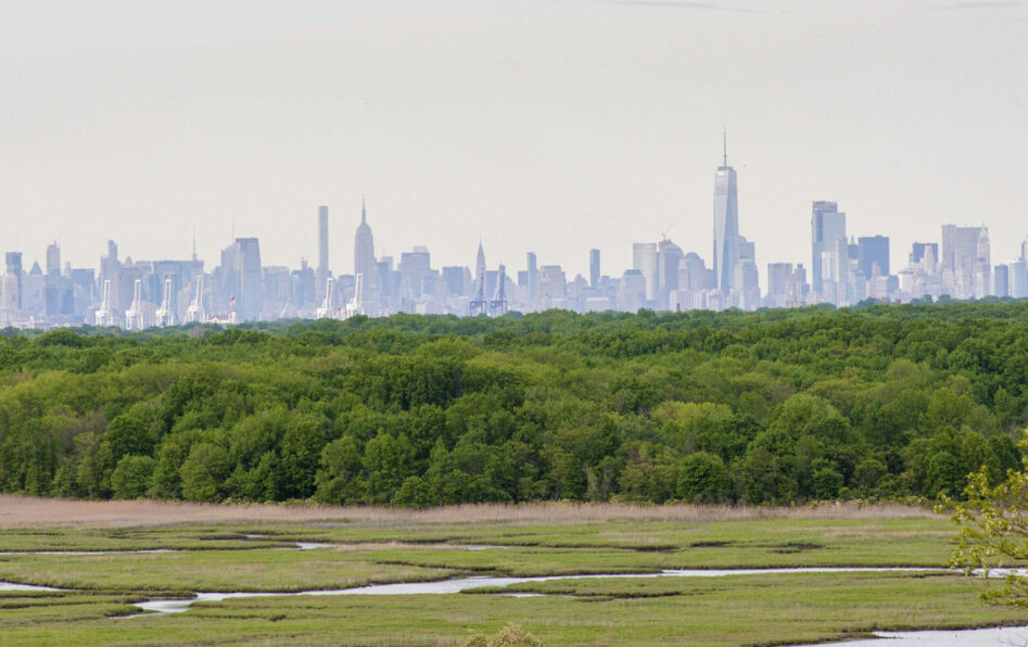 L’ancienne décharge de Freshkills à New York (États-Unis), en voie d’être reconvertie en parc. À l’horizon, les tours du Lower Manhattan. © Richard B. Levine/Newscom/Sipa