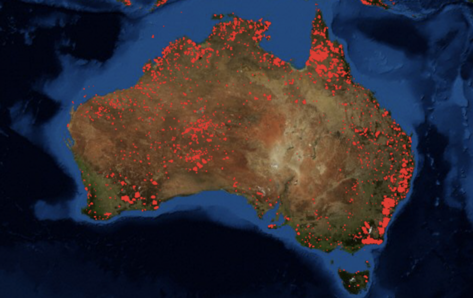 Vue satellitaire des incendies en Australie au mois de décembre (cc) Nasa