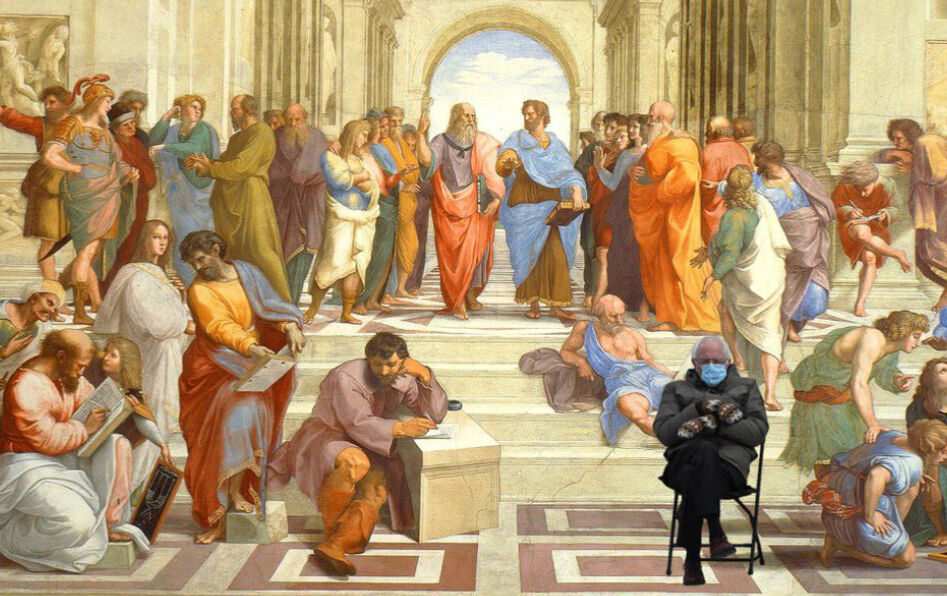• Le terme de « meme » a été proposé pour la première fois par le biologiste et spécialiste de la théorie de l’évolution Richard Dawkins dans son ouvrage Le Gène égoïste (1976). Ce néologisme, créé à partir de « gène » et de « mimétisme », désigne un élément culturel reconnaissable, reproduit et transmis par l’imitation du comportement d’un individu. Dans le cas qui nous occupe, c’est l’impassibilité de Bernie Sanders face à la cérémonie d’investiture qui est reproduite à l’envi. La silhouette est découpée, puis insérée sur une image célèbre ou flanquée d’une légende humoristique : un « Bernie » renfrogné s’invite au baptême de Simba du Roi Lion, sur le trône de fer de Game of Thrones ou même entre Platon et Aristote dans L’École d’Athènes de Raphaël.