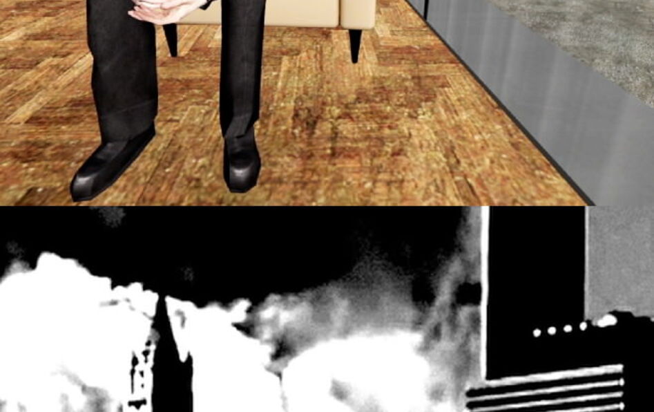 L’aéroport avec ses lignes horizontales, ses flux de voyageurs, est un espace de fin de l’histoire, statique, où les mouvements se répètent. L’aéroport représente une modernité mécanisée : escalators qui tournent en boucle, manège des avions… Seule manquait une tension dramatique, que le 11-Septembre fournit. Cette catastrophe historique et politique ultraviolente suspend ces flux. L’usage de la vidéo permet de superposer deux dynamiques : Fukuyama sur un tapis roulant, ligne horizontale, et New York, ville verticale frappée en son cœur.