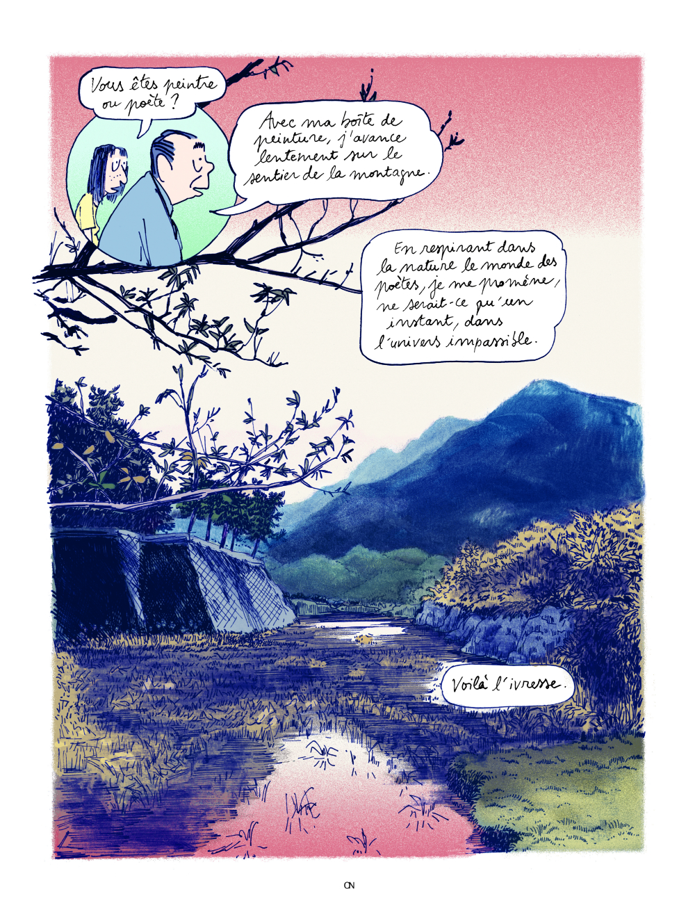 • Mais comment approcher l’« évanescence des choses » ? Dans la bande dessinée, s’instaure une sorte de rivalité mais aussi de dialogue entre le héros de Sōseki, qui parle de peinture sans peindre, et Catherine Meurisse, qui se représente sans cesse un pinceau à la main. Il y a des gags, mais la légèreté et la décontraction du propos ne sont qu’apparentes – en fait, cet album peut se lire comme une excellente introduction à l’esthétique japonaise du paysage, jamais pesante, mais scrupuleusement référencée.