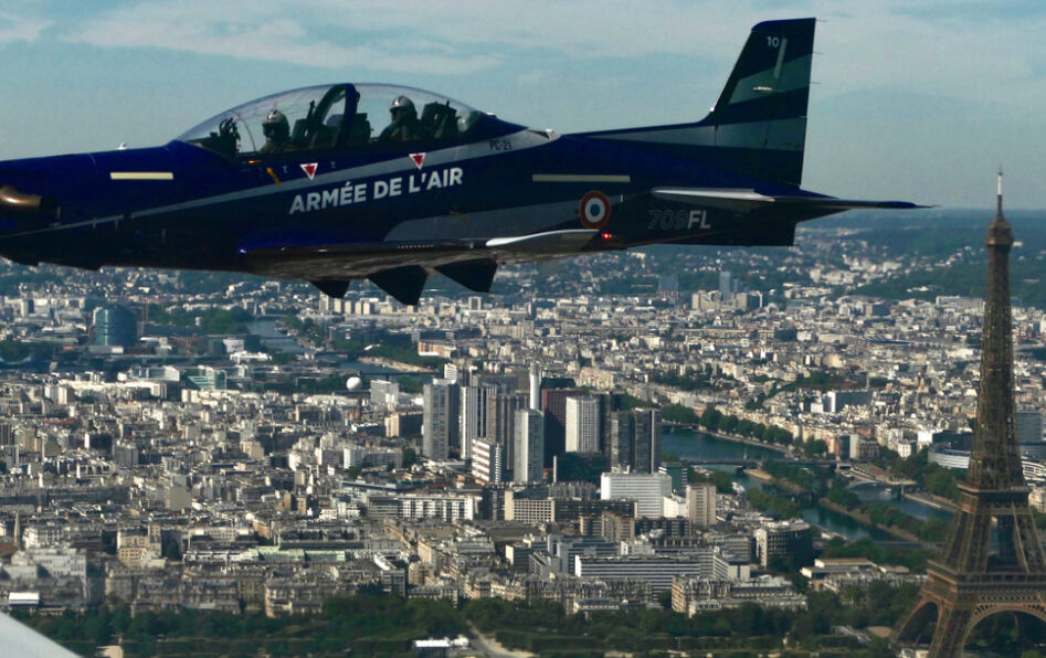 Un avion PC-21 au dessus de Paris, vu depuis un Xingu de l’EAT 319.00 (école d’aviation de transport). © Pierre Terraz