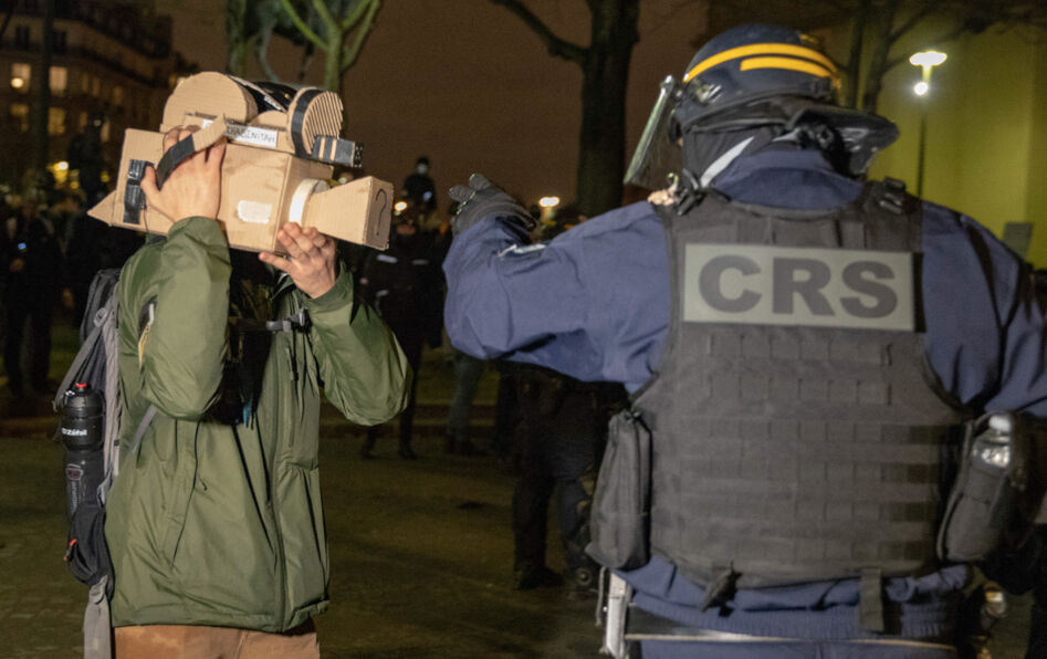 À Paris, le 21 novembre 2020, un journaliste approche un membre des forces de l’ordre avec une fausse caméra. © Édouard Monfrais/Hans Lucas via AFP