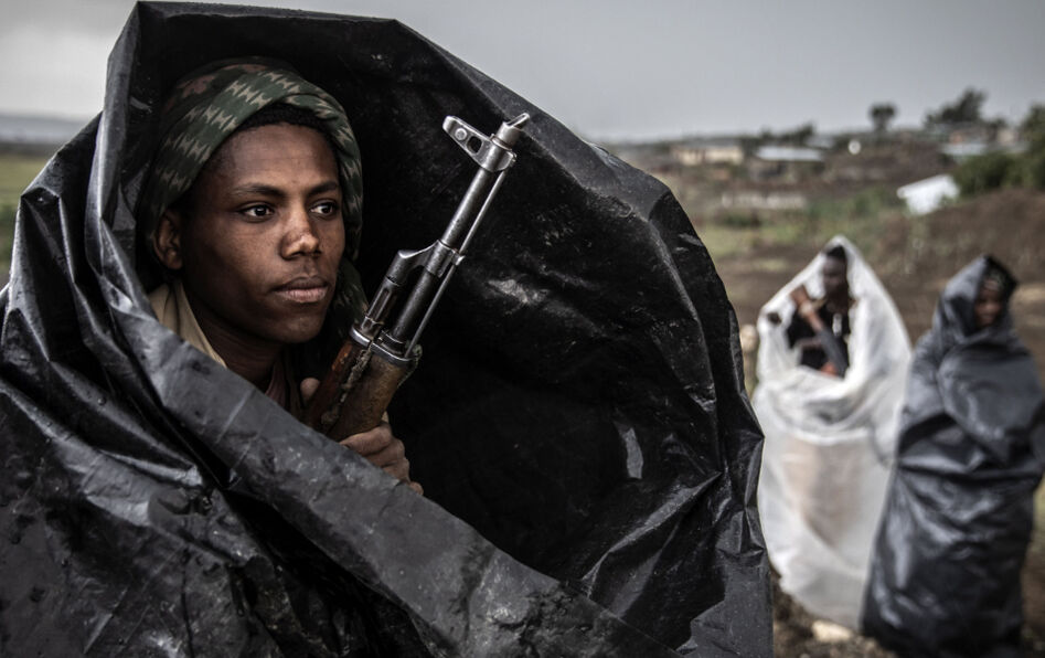 Un jeune soldat tigréen s’emmitoufle dans un sac plastique lors d’un orage au sud de la ville de Mekele, la capitale de la région du Tigré, au nord de l’Éthiopie, le 23 juin 2021. © Finbarr O’Reilly/The New York Times/Redux/REA