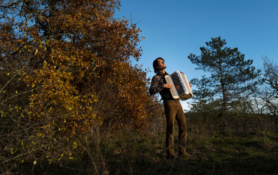 C’est avec un être singulier que je parcours en voiture les routes du Morvan, dans la lumière magique de la fin d’après-midi. Je l’ai rencontré la veille et il m’emmène à un cours d’improvisation musicale qu’il donne chaque semaine. Albin a 22 ans. Jeune homme au regard sérieux mais un peu ailleurs, il vit depuis toujours dans la région de Vézelay. Après son bac, il a choisi de suivre ses deux passions, qu’il pratique depuis l’enfance : la musique et les chevaux. Il vit au centre équestre du bourg de Montillot, dans une caravane sans eau courante ni électricité. Il donne des cours d’équitation et fait de la voltige. Quant à la musique, il l’aime, se souvient-il, depuis qu’il a 2 ou 3 ans – à cette époque, il ne quittait pas son harmonica. À 6 ans, ses parents l’ont inscrit à l’école de musique et il a commencé l’accordéon. En autodidacte, il s’est mis au saxophone, puis au violon. Il maîtrise désormais plus d’une dizaine d’instruments mais peut en jouer une quarantaine. Il y a peu, il a trouvé chez un ami une kora, un instrument traditionnel à cordes d’Afrique de l’Ouest. Il l’a restaurée, réaccordée et appris à en jouer en quelques jours. « Cela m’a donné envie d’apprendre la harpe », ajoute-t-il.