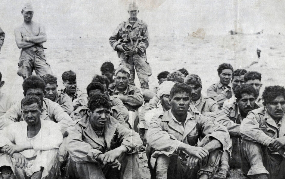 Groupe de prisonniers algériens encadrés par des militaires français. Photographie anonyme vers 1958 pour la propagande française. © Collection IM/Kharbine-Tapabor