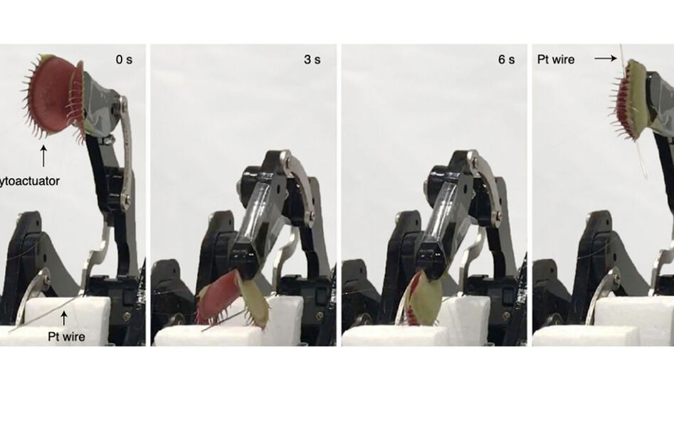 Innovation : un robot s’empare d’un bout de fil de fer par le biais d’une dionée, qui lui tient lieu de pince préhensile. © www.nature.com