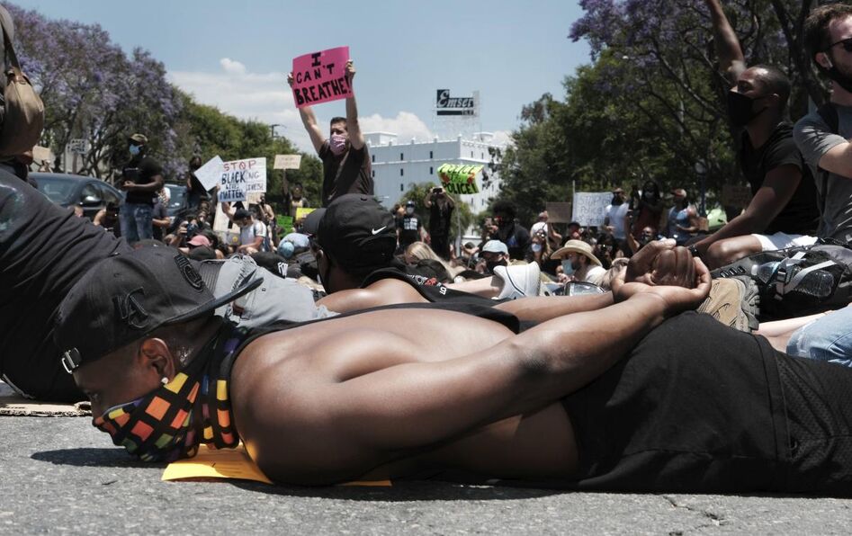 À West Hollywood (Californie, États-Unis), le 3 juin, des manifestants du mouvement Black Lives Matter et des communuautés LGBTQ se couchent dans la rue les mains dans le dos afin de protester contre le meurtre de George Floyd par la police. © Richard Vogel/AP/Sipa