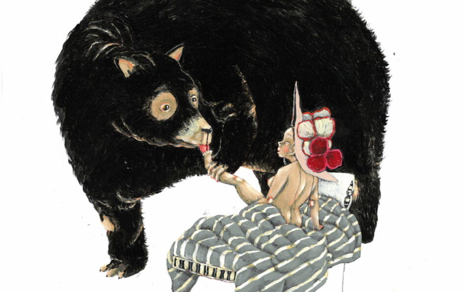 « Un conte ne ment jamais. » Sous cette devise, le musée d’Ethnographie de Genève met en scène des contes tirés de l’imaginaire européen, et leur face cachée. Que découvre-t-on ? Que si nous croyons connaître ce corpus à travers Perrault, Grimm et Andersen, nous n’en lisons en réalité qu’une infime partie. Sont présentées huit histoires, peu connues, dont la fable érotique de L’Ours amoureux, illustrée pour l’occasion par l’artiste belge Carll Cneut (photo). Dans cette légende alpine, un ours ravit une jeune fille dans les bois, mais il ne la dévore pas. Mieux, il en tombe amoureux, la courtise et finit par lui lécher les pieds… Le mammifère fut longtemps un symbole érotique avant d’être associé à la virilité.