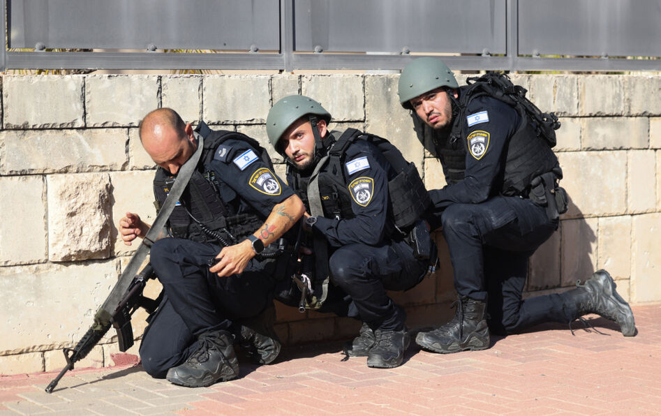 Ashkelon (Israël), le 7 octobre 2023. Des membres des forces armées israéliennes se mettent à l’abri pendant que les sirènes retentissent et que des roquettes sont tirées depuis la bande de Gaza vers Israël. © Ahmad Gharabli/AFP
