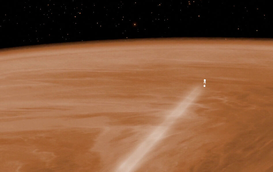 Vue d’artiste de l’approche de Vénus par la sonde Venus Express, qui orbita autour de la planète de 2006 à 2015. © ESA