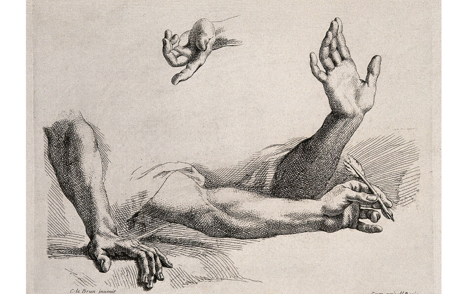 Trois avant-bras et une main, étude. Gravure de Charles Le Brun (1619-1690). © Wellcome collection