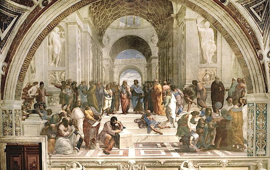 Maintenant, regardez ce détail de la fresque de L’École d’Athènes peinte par Raphaël (voir figure 6). L’interprétation canonique de ce tableau est célèbre : à gauche, Platon indique, avec son doigt tendu, le ciel des Idées, signifiant par là qu’il est un philosophe idéaliste, tandis qu’Aristote désigne quant à lui la Terre, montrant qu’il est beaucoup plus empiriste. Mais je dirais les choses autrement : à mon sens, chacun d’eux insiste sur une dimension différente du travail du cartographe. Pour Platon, qui pointe le doigt, ce qui compte, c’est le point fixe, le nord, ou la ligne de fuite, comme vous voulez. Pour Aristote, qui a la main à plat, c’est le plan, le support qui domine.