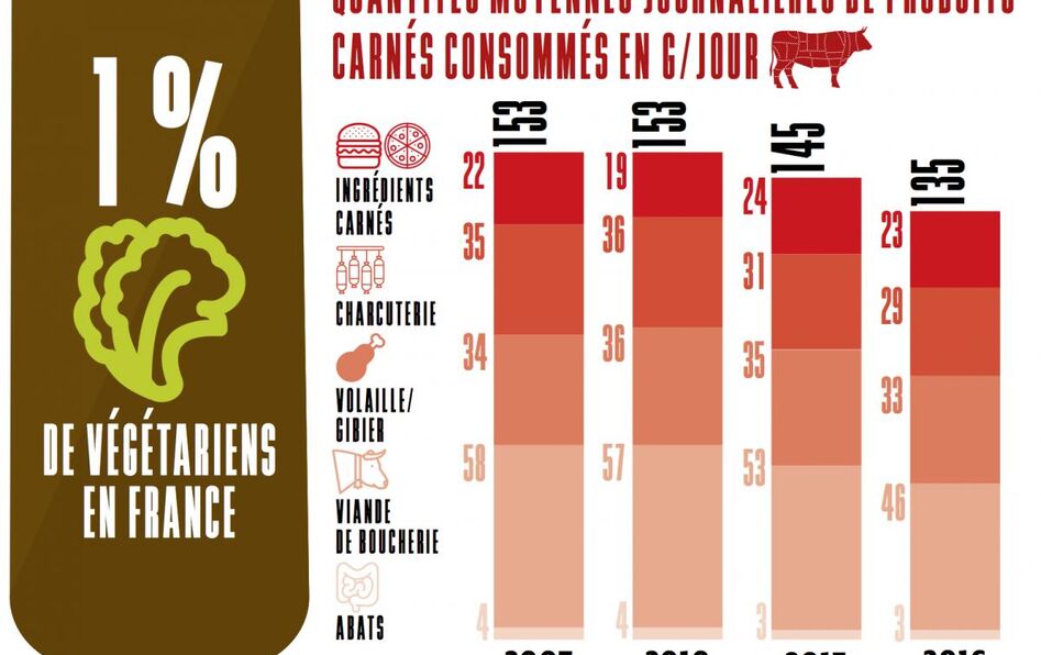 L’époque annoncée par l’anthropologue serait-elle en passe d’advenir ? On peut être tenté de le penser si l’on prend connaissance des résultats de l’étude du Centre de recherche pour l’étude et l’observation des con­ditions de vie (Crédoc) parue en septembre dans le bulletin Consommation et modes de vie consacré à l’évolution de la consommation de viande en France. En dix ans, celle-ci a baissé de près de 12 %, passant de 58 à 46 grammes par jour. En 2018, 35 % des Français déclarent avoir limité leur consommation carnée. Cette chute concerne toutes les couches sociales : même si la baisse la plus importante se produit chez les cadres et professions libérales (- 19 %), celle des ouvriers est presque aussi forte (- 15 %). En cause : les considérations de santé, de bien-être animal et d’impact de l’élevage sur l’environnement, mais aussi des raisons économiques – le prix de la viande n’a cessé d’augmenter ces dernières décennies.