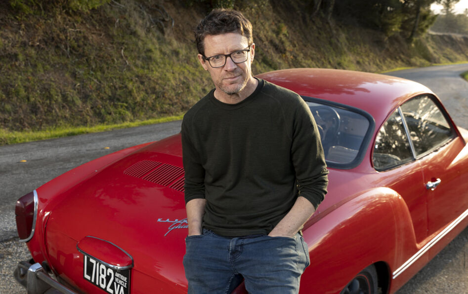 Matthew Crawford pose devant sa Volkswagen Karmann Ghia de 1970, le 18 février 2021, au bord d’une route californienne. © Frédéric Neema/LAIF-REA