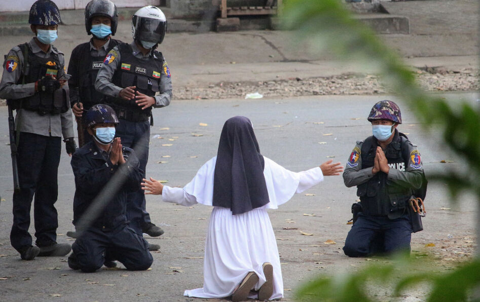 • Lundi 8 mars, à Myitkyina, en Birmanie : la religieuse Ann Roza Nu Thawng s’agenouille pour empêcher les forces de police de tirer sur les manifestants protestant contre le coup d’État militaire. Avec succès : deux policiers imitent son geste.