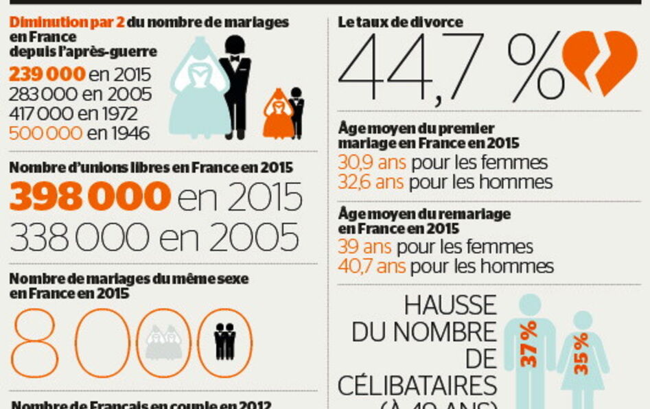 Jamais il n’y a eu aussi peu de mariages, jamais on ne s’est marié si tard, jamais on a autant divorcé… et jamais l’espace du couple, de la reproduction sexuée et de la famille n’a été aussi important pour les individus ! Tels sont les enseignements paradoxaux qui se dégagent des dernières études sur le mariage. Selon la plus récente, publiée par l’Insee, le nombre de mariages en 2015 s’établit à 239 000, soit moitié moins qu’en 1946. Mais le nombre des unions libres augmente, lui, symétriquement, passant de 338 000 en 2005 à 398 000 en 2015. Une tendance que l’on observe dans toute l’Europe et aux États-Unis. Seul un homme et une femme sur deux se marieront dans les générations à venir. Deux ans à peine après la promulgation du mariage pour tous, même les mariages entre personnes de même sexe diminuent, passant de 10 500 en 2014 à 8 000 en 2015. Tandis que l’âge moyen du mariage (autour de 30 ans contre 20 ans dans les années 1930) recule, le taux de divorce se stabilise (autour de 44 %), et le taux des naissances hors mariage explose (près de 60 %).
