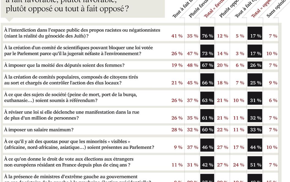 Or, c’est précisément cette évidence qui est en train de se fissurer, de prendre l’eau. Cela fait un moment déjà qu’on entend parler de « crise de la représentation » : loin de se comporter en représentants de la volonté du peuple, nos politiciens ont tendance à former une caste dirigeante fermée, composée de professionnels du marketing idéologique, proches des puissances de l’argent, complices entre eux, oublieux des intérêts communs. Mais cette crise de la représentation est souvent décrite dans des termes abstraits. Voici donc des éléments de réflexion plus concrets : le sondage réalisé par TNS-Sofres pour Philosophie magazine constitue une photographie pour le moins sidérante de la crise de la représentation. Jugez plutôt : 49 % des Français considèrent que la démocratie a reculé en France depuis l’an 2000, quand 14 % d’entre eux seulement estiment qu’elle a progressé. Ce sentiment partagé d’une trahison des principes démocratiques s’explique certainement par des facteurs liés à la conjoncture : la cote de popularité du Président Sarkozy est au plus bas ; l’affaire Woerth a indigné les Français, avant que les soupçons de corruption de la République ne soient aussitôt relancés par l’affaire Karachi ; la circulaire sur les Roms, les écoutes de journalistes, l’effacement de la fonction du Premier ministre s’apparentent à des faits du prince ; le passage en force de la réforme des retraites a parachevé cette impression d’indifférence du gouvernement à l’opinion publique. Cependant, le mécontentement n’est pas le seul apanage de la gauche : un électeur de l’UMP sur trois estime que la démocratie est en recul sur la décennie écoulée, un sur deux pense qu’elle a stagné… C’est là le signe d’un malaise dépassant les clivages traditionnels et les effets de conjoncture : il exprime une lassitude profonde vis-à-vis du principe même de la représentation. Le citoyen ne se reconnaît plus dans le jeu de rivalité mimétique des partis, et encore moins dans l’action des hommes politiques ; il s’estime dépossédé de la voix qu’il exprime en glissant son bulletin dans l’urne. Sur les questions importantes – l’euro et l’Union européenne, la gestion de la crise économique depuis 2008, la réforme de la fiscalité, la politique énergétique et écologique –, la majorité des électeurs ne se sent pas prise en compte.