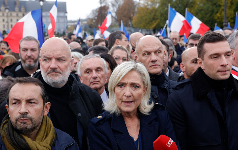 La député du parti d’extrême droite Rassemblement national (RN) Marine Le Pen (au centre), le président du RN Jordan Bardella (à dr.) et le député RN Sébastien Chenu (à g.) défilent lors de la manifestation contre l'antisémitisme à Paris du 12 novembre 2023. © Geoffroy Van der Hasselt/AFP