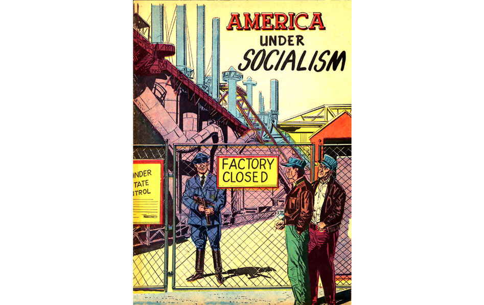 Lithographie couleur en couverture du magazine “America Under Socialism” (“L’Amérique sous le socialisme”), années 1950. © Bridgeman Images