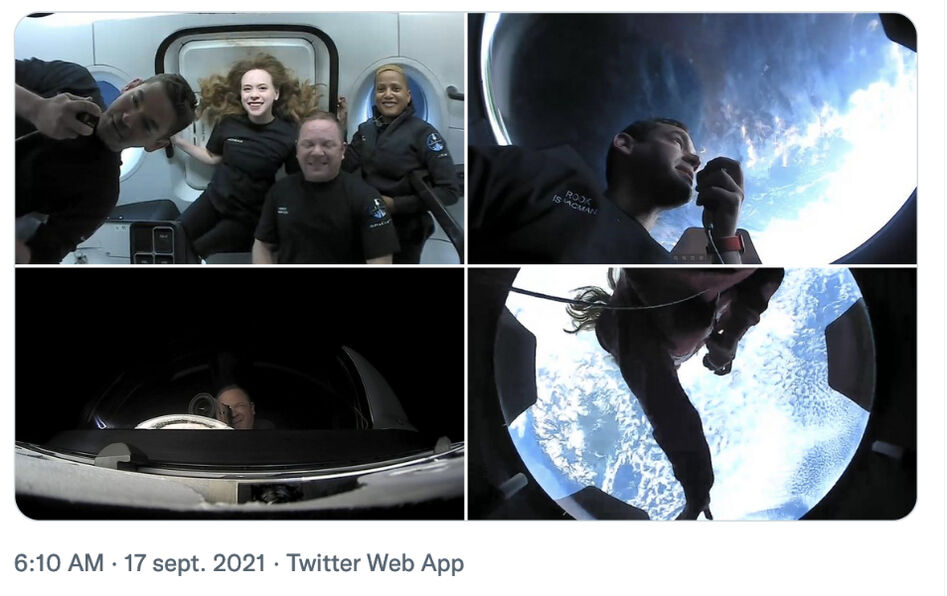 Chris Sembroski, Sian Proctor, Jared Isaacman et Hayley Arceneaux, les quatre “touristes spatiaux” de la mission Inspiration 4, à bord de la fusée de SpaceX, le 17 septembre 2021. © Capture d'écran du compte Twitter : inspiration4x