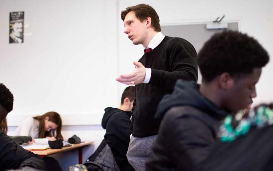 Clément Filippi, professeur de philosophie au lycée Léonard-de-Vinci de Saint-Michel-sur- Orge, avec une classe de Terminale. © Marie Genel pour PM