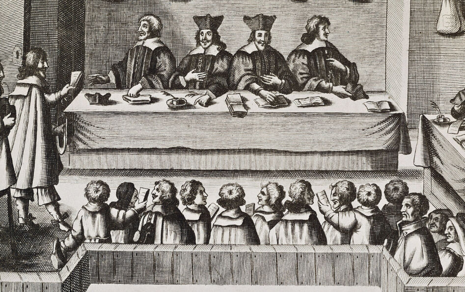 Représentation de la Cour de justice, avocats, procureurs et jurés, sous le règne d’Henri IV (1553-1610). Gravure du XVIIe siècle. © Aisa/Leemage