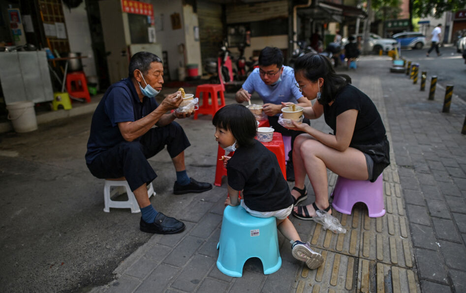 Une famille mange à côté d’un étal à Wuhan, dans la province centrale chinoise du Hubei, le 22 mai 2020. © Hector Retamal/AFP