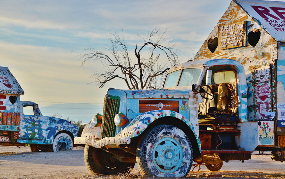 Le terrain de cette ancienne base militaire abandonnée a été depuis le début des très productivistes fifties repeuplé par d’anciens beatniks, écolos de l’extrême, anarchistes et jeunes marginaux. Dans ce terminus de la société de consommation, un bric-à-brac de camping-cars hors d’âge, de cahutes en tôle et d’objets de récupération peuple le paysage lunaire du Mojave : canapés défoncés débordant de mousse, vieilles télévisions, baignoires fêlées, poupées débraillées aux yeux manquants, pare-chocs rouillés, enjoliveurs et sièges de voiture zébrés par les années. Baudrillard, si inspiré par les États-Unis, dit, cette fois dans La Société de consommation, que celle-ci « a besoin de ses objets pour être, et plus précisément elle a besoin de les détruire ». À Slab City, on a choisi une voie alternative, en donnant systématiquement à la profusion d’objets que produit l’Amérique une deuxième vie. Voire une septième ou une quinzième. Quant à ceux qui ne servent vraiment plus, ils habitent le paysage, comme si la société de consommation les avait vomis là, dans le désert. Ce foisonnement d’objets devenus non fonctionnels évoque des vestiges flottants, comme une robe de soirée déchirée glissant à la surface de l’eau après le naufrage du Titanic. Mais postés dans l’immuabilité du désert plutôt qu’emportés par les flots, ils forment un décor baroque, presque carnavalesque, faisant de Slab City la plage où ils se seraient finalement échoués à jamais.