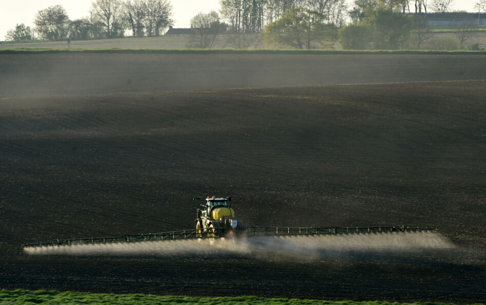 Piacé, dans la Sarthe (72), le 23 avril 2021. Un agriculteur pulvérise du glyphosate, un herbicide “total” fabriqué par l’entreprise Monsanto, dans un champ de maïs. © Jean-François Monier/AFP