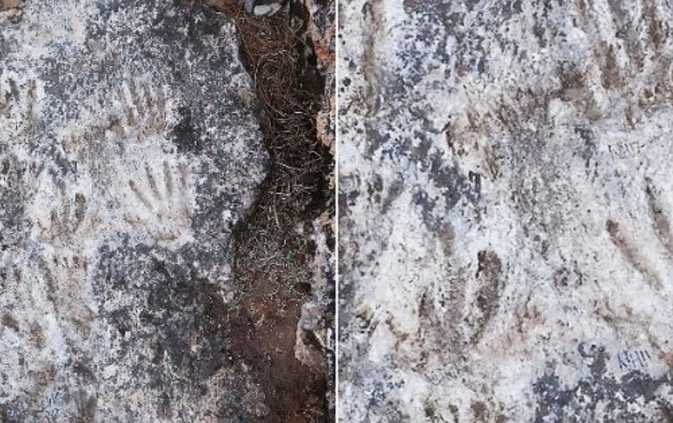 Des archéologues ont découvert une série d’empreintes de mains et de pieds découvertes dans le village de Quesang, au Tibet. Ces dessins ont été réalisés il y a environ 200000 ans. © Science Bulletin