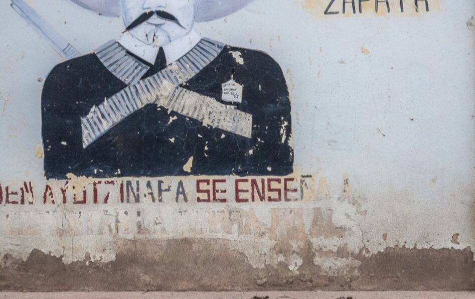 « Volveré y serés millones. » C’est le Che qui le dit, le regard halluciné, vide, presque déjà mort. Les ombres noires de son visage se détachent sur le fond turquoise d’un immense pan de mur craquelé. « Quand je reviendrai, vous serez des millions. » Mais pour l’instant, il n’y a personne à part quelques chiens errants. Il est 8 heures du matin à peine et l’école normale agraire d’Ayotzinapa est déserte. On peut visiter tranquillement cet ensemble de béton perdu dans les montagnes du Guerrero, région misérable située entre le port mafieux d’Acapulco et la capitale du Mexique – une contrée que ne conseille aucun guide touristique. En contrebas d’une route déserte, on passe d’abord devant des bâtiments anciens recouverts de proclamations sur l’éducation du peuple. Les écoles normales agraires ont été créées dans les années 1920, époque où l’on nationalisait le pétrole et expropriait les compagnies étrangères. La révolution mexicaine s’inspirait alors de l’Union soviétique. Il s’agissait de former des enfants de paysans illettrés afin qu’ils puissent retourner dans leurs villages et devenir instituteurs. Puis on découvre un campus champêtre classiquement composé de dortoirs, d’un immense préau, de bâtiments administratifs et de salles de cours. Le délabrement est visible, le découragement et le doute palpables. Tant d’idéaux sont pourtant inscrits sur les murs. Ayotzinapa, fidèle à la tradition de la peinture murale politique mexicaine, exhibe en couleur son histoire et ses rêves. Lénine est partout – Trotski, pourtant exécuté sur ordre de Staline à Mexico, nulle part. La geste de la jeunesse rebelle, encadrée des figures de la révolution mexicaine (on les reconnaît à leurs moustaches et à leurs sombreros), s’étale dans tous les styles : épique, naïf, ultraréaliste, psychédélique, folklorique. Mais c’est toujours la même histoire : les étudiants finissent criblés de balles par les policiers. Le peuple se fait tabasser. Les mères pleurent mais ne sont guère épargnées. À l’abri derrière les hommes armés, les bourgeois récupèrent de lourds paquets de dollars. Les têtes de mort hilares et les gueules de requins se glissent un peu partout. C’est l’histoire du Mexique vue par les étudiants révolutionnaires.