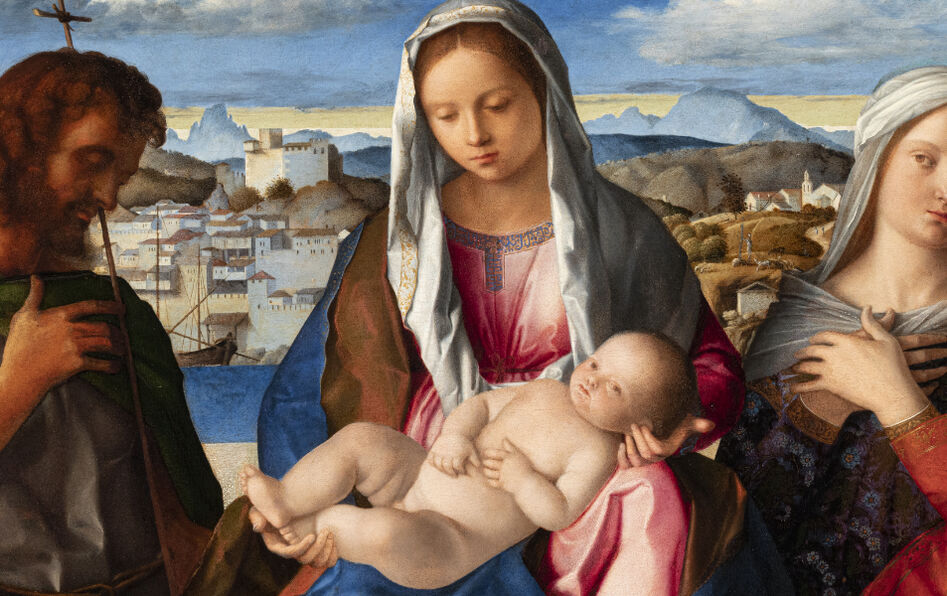 Giovanni Bellini (1430-1516), “Vierge à l’Enfant avec saint Jean-Baptiste et une sainte (Conversation sacrée Giovanelli)”, v. 1500. Huile sur bois, 55 x 77 cm. Conservé à la Gallerie dell’Accademia, Venise (Italie). © G.A.VE Archivio fotografico – su concessione del Ministero della Cultura