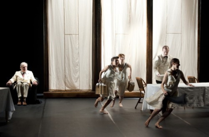 Il compose un tableau constitué de surimpositions d’images rêvées et de motifs projetés. Dans la survivance de la mémoire se dessinent des pulsions incarnées, un abîme de théâtre où se joue une vérité. Que reste-t-il de ces images ? Un acteur au visage ténébreux, tendu par l’inquiétude : celui de Josef Bierbichler, alias Gustav von Aschenbach – un compositeur en villégiature à Venise, librement inspiré de Mahler, dans le roman. La musique concrète d’un piano démonté, aux échos dissonants, heurte la douceur des images et rompt la langueur du temps. De longs rideaux volants barrent le passage vers un au-delà de la scène, et de la pensée, d’où surgit le jeune Tadzio, éphèbe au corps dansant, dont s’éprend Aschenbach.