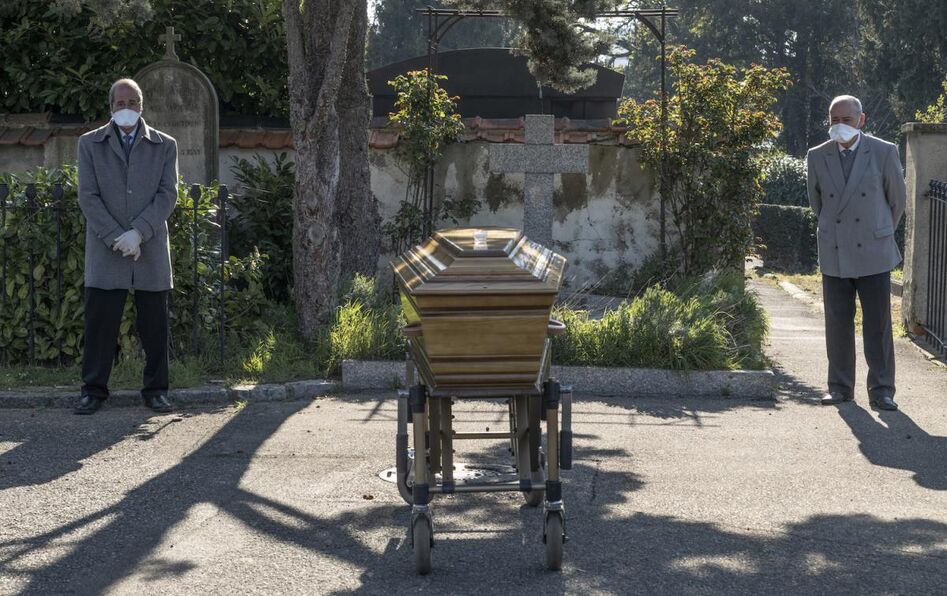 À Mulhouse (Haut-Rhin), le 2 avril, les funérailles d'une femme âgée morte du Covid-19 se font dans la plus stricte intimité du fait des mesures de confinement. © Véronique de Viguerie/Getty Images/AFP