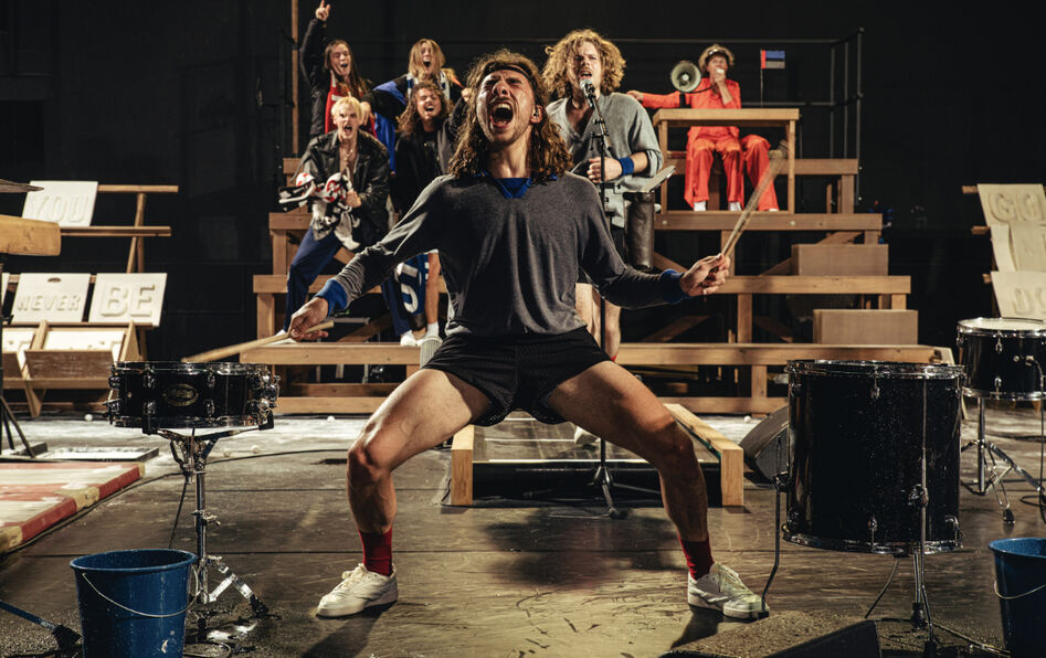 « Sauve qui peut avant que tu crèves, avant que je crève, avant qu’on crève tous. Toc, toc, toc, qui est là ? » Vous entendrez ces paroles aux accents shakespeariens – la question est celle du portier dans Macbeth – chantées et accompagnées en musique pendant une heure, à des tempos variables. Mais rien de mortel ! Car les comédiens, dans le rôle des musiciens, pom-pom girls, supporters et chauffeurs de salle, nous emportent à la sueur de leur front dans ce tourbillon d’enfer orchestré tambour battant par la plasticienne et chorégraphe flamande Miet Warlop. Elle met en scène l’épuisement du corps, engagé dans la petite histoire qu’est ce spectacle et la grande qu’est l’existence. Sur le plateau, un métronome sous cloche et des agrès de gymnastique : une poutre sur laquelle s’active une violoniste, un tapis de course emprunté par le chanteur, un tremplin pour le pianiste, tandis que le contrebassiste fait des abdos et le batteur des squats. En fond de scène, un public en furie dans les gradins. Le son est répétitif, seul change le rythme, lent ou frénétique. Mais l’attention est mystérieusement tenue par cette métaphore de la vie contemporaine, où « la force motrice de l’accélération est également alimentée par une promesse culturelle forte », comme le souligne le philosophe Hartmut Rosa. Seule importe en effet pour nous la somme des expériences et des possibilités offertes par la vie ici-bas, et non plus après la mort : « dans la société moderne séculaire, l’accélération sert d’équivalent fonctionnel à la promesse (religieuse) de vie éternelle ». Ce qui s’appelle vivre vite ?