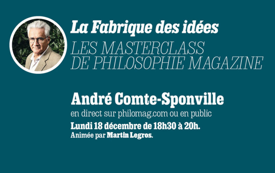 C'est ce soir ! Philosophie magazine vous invite à sa première « Fabrique des idées », nos masterclass de philosophie. Pour ce premier événement, qui se tient ce lundi 18 décembre au Club de l’Étoile (Paris XVIIe), nous avons le plaisir de recevoir André Comte-Sponville. L’invitation, ouverte à toutes et à tous, est gratuite pour les abonnés. Une diffusion en distanciel est également prévue pour les personnes ne pouvant se rendre sur place, et un replay sera disponible ensuite pour les abonnés numériques.