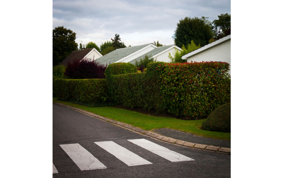 Une rue de la résidence du Parc a Lésigny. Le constructeur-promoteur, William Jaird Levitt, a conçu le tracé des rues et l’alternance des motifs architecturaux de façon à ce qu’aucune perspective ne puisse donner l’impression de constructions en série, ce que ces pavillons sont pourtant. Photographie extraite de “Pursuit of Happiness”. © Julie Balagué/Signatures