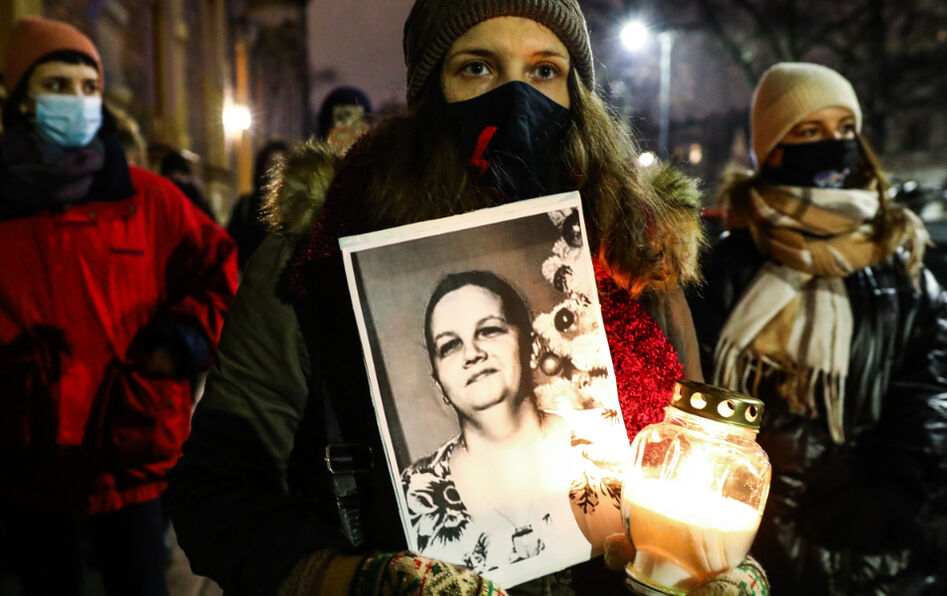 Cracovie (Pologne), le 26 janvier 2022. Des manifestantes brandissent un portrait d’Agnieszka T., décédée suite à l’application de la loi polonaise de 2021 qui réduit drastiquement les possibilités d’avortement. © Beata Zawrzel/NurPhoto/AFP