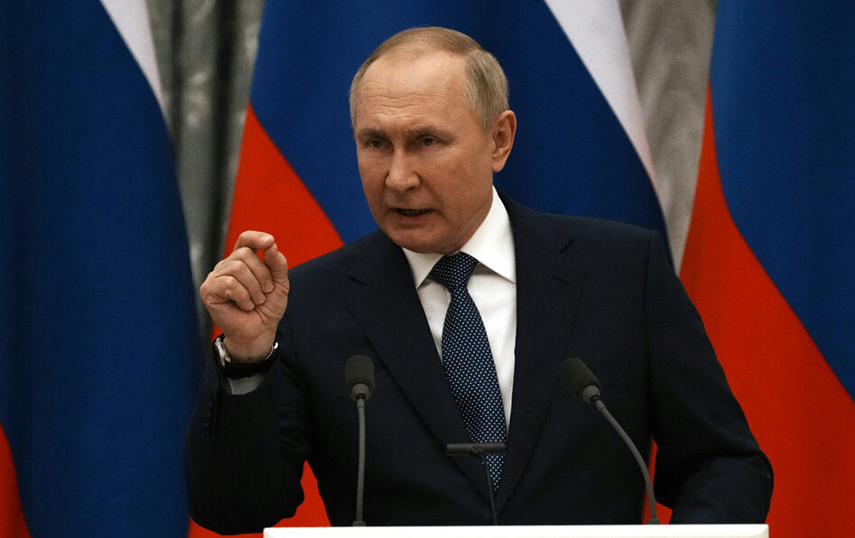 Vladimir Poutine en conférence de presse commune avec Emmanuel Macron, après le meeting des deux chefs d’État à Moscou, le 7 février 2022. © Thibault Camus/Pool/AFP