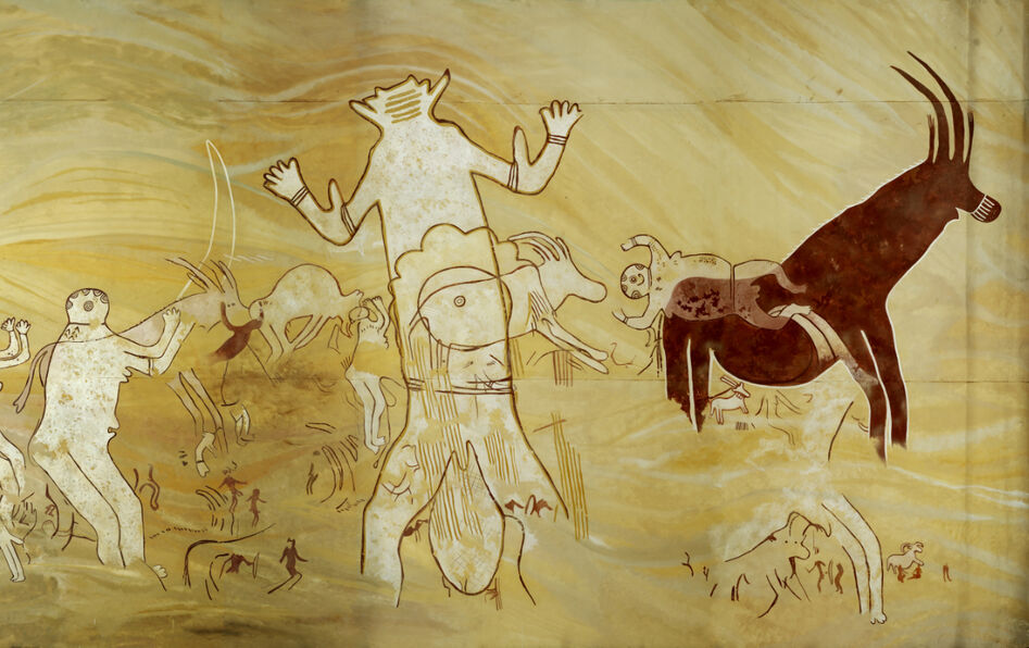 Le corpus proposé au spectateur s’intéresse ainsi aux « relevés » de ces peintures rupestres, des dessins réalisés par des équipes de chercheurs-aventuriers à partir de calques effectués à même la pierre – en l’absence de photos couleur, la copie dessinée est la seule façon de restituer l’apparence globale des peintures. Le corpus de Préhistomania mêle des relevés provenant de la collection Frobenius, ethnologue allemand passionné par l’Afrique dont les équipes ont fourni certains des plus beaux dessins de l’époque, et d’autres issus des collections du musée de l’Homme, comptant pour les expéditions de Henri Lhote ou encore de l’abbé Breuil – célèbre pour avoir mis au jour la grotte de Lascaux.
