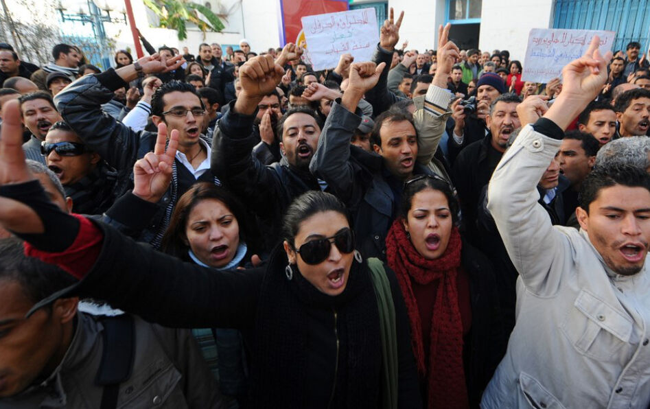 Tunis, 27 décembre 2010. Des manifestants protestent contre le gouvernement et affirment leur soutien aux habitants de Sidi Bouzid. © Fethi Belaid/AFP