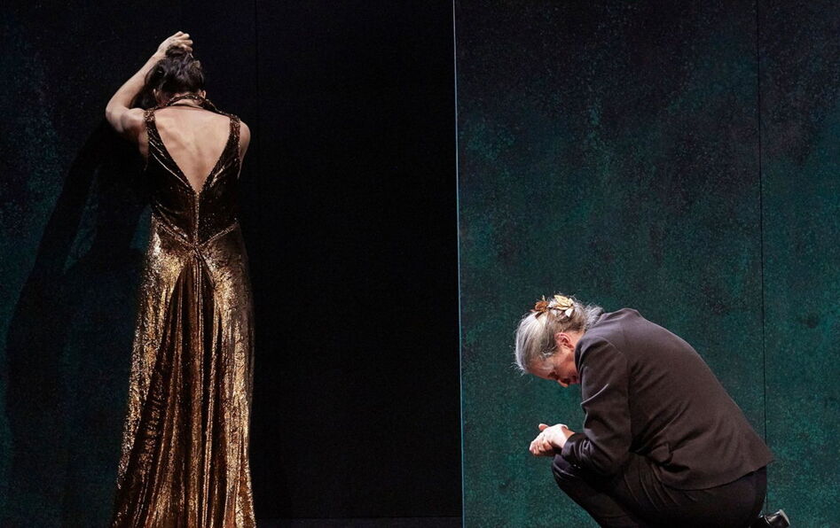 Longue, fine, dans une souple robe lamée d’or, voici que Phèdre s’avance, pieds nus, mobile statue d’elle-même, hagarde et asphyxiée, éperdue de désir pour Hippolyte, son propre beau-fils, à peine plus jeune qu’elle (« Le feu embrase mon cœur et l’affole/ Incendie sauvage, au tréfonds de mon corps/ Le désir couvait, il court dans mes veines/ Et me ravage la chair. »)
