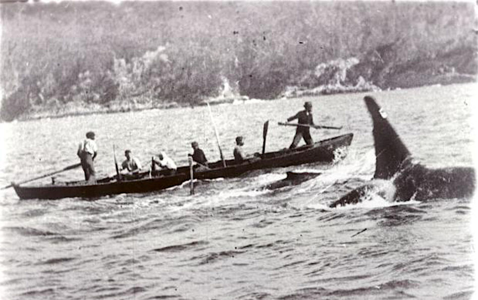 Chasse à la baleine dans la baie de Twofold (Australie), vers 1900. Image tirée du film documentaire de 1910 intitulé “Whalechase in Twofold Bay” (“Chasse à la baleine dans la baie de Twofold”). © Eden Killer Whale Museum