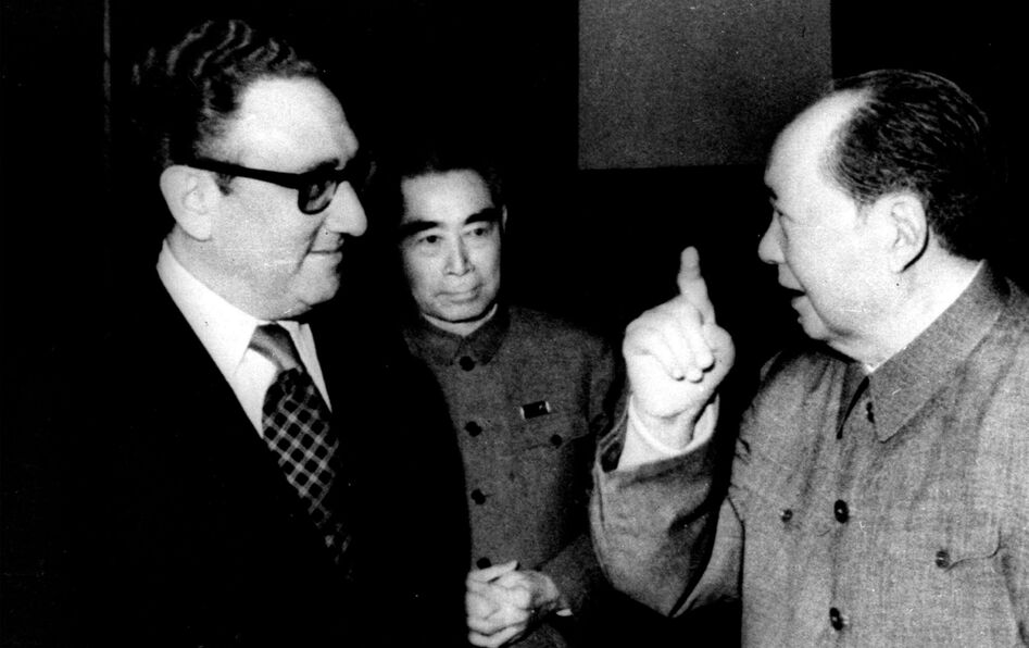 Zhongnanhai, siège du gouvernement chinois, Pékin (Chine), 17 février 1973. Henry Kissinger, envoyé présidentiel, rencontre le président de la Chine communiste Mao Tsé-toung (à dr.) et le Premier ministre Zhou Enlai (à g.). Alors que la guerre du Vietnam s'éternise, Kissinger déclare à Zhou Enlai en 1972 que “si nous pouvons vivre avec un gouvernement communiste en Chine, nous devrions pouvoir l'accepter en Indochine”. © AP/Sipa
