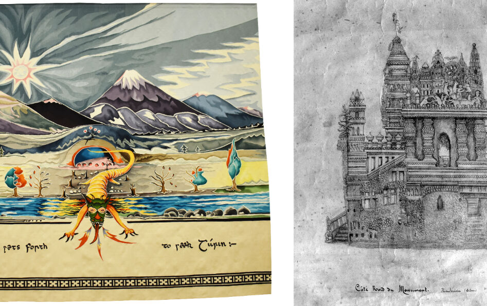 À gauche, “Glorund Sets Forth to Seek Turin” (“Glorund part à la recherche de Turin”), par J. R. R. Tolkien. À droite, dessins de Joseph Cadier, réalisés durant la construction du Palais idéal, côté nord.