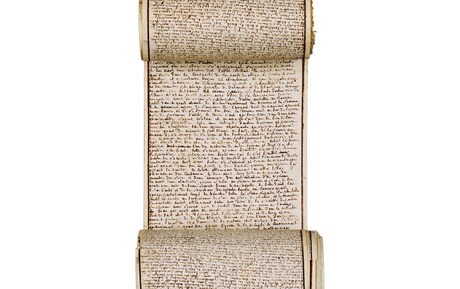 Les transformations du libertinage constituent le fil rouge de l’exposition Sade. Marquis de l'ombre, prince des Lumières. L'éventail des libertinages du XVIe au XXe siècle placée sous la direction de Pascal Fulacher et Jean-Pierre Guéno, à l’Institut des Lettres et Manuscrits. Constituée principalement de manuscrits et d'éditions précieuses, signés Boccace, Pascal, Casanova, Restif de la Bretonne…, cette rétrospective plutôt austère dévoile aussi un trésor pour les curieux, exposé pour la toute première fois en France : le fameux rouleau autographe des 120 journées de Sodome ou l’École du libertinage, écrit en 1785 alors que Sade est incarcéré à la Bastille.