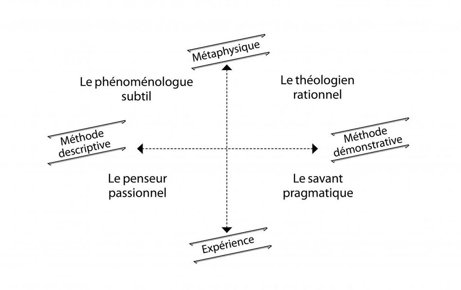 Mais selon quels critères effectuer ces distinctions ? Pour construire ce test, deux dimensions ont été retenues. Premièrement, on peut différencier les IP suivant qu’elles s’intéressent à des objets métaphysiques – Dieu, le Monde, le Moi, le Bien… – ou, au contraire, à des objets concrets, dont on peut faire l’expérience – les comportements humains, le fonctionnement des sociétés, la nature biologique, l’univers astronomique, le vivant… Cela nous donne donc un premier axe, thématique pour différencier les grandes attitudes philosophiques. Sur un tel axe, Platon se situera en haut, du côté de la métaphysique, et Nietzsche en bas, du côté de l’expérience. Deuxièmement, on peut distinguer les philosophies selon leurs méthodes. Certains philosophes sont aussi des écrivains, et leur manière de faire de la philosophie est à la fois descriptive et littéraire. C’est le cas, par exemple, de Nietzsche et de Montaigne. Mais d’autres philosophes emploient un langage beaucoup plus formalisé et suivent une méthode d’argumentation rigoureuse, voire « géométrique ». Ils procèdent, dans leurs ouvrages, à des démonstrations logiques. C’est le cas de Spinoza. Nous avons donc notre second axe.