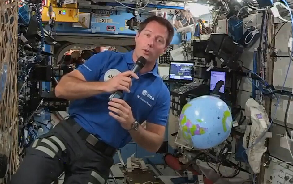 30 avril 2021. Capture d’écran d’un “livestream” de l’Agence spatiale européenne, pendant lequel Thomas Pesquet s’adresse, depuis la Station spatiale internationale, aux journalistes réunis au Centre national d’études spatiales (CNES). © ESA/AFP